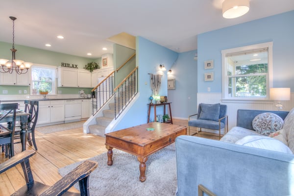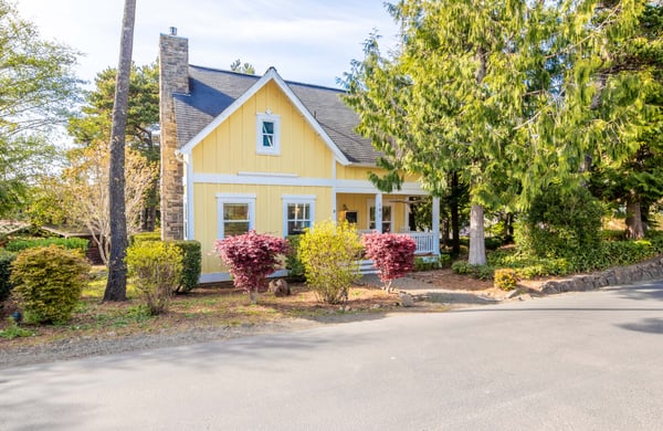 Step inside the charming Tides at Bella Beach and you’ll feel your heart sing at the cheerful blue beach décor and sun streaming through the high windows. Located just across the street from Café C’est la Vie and down the block from Bella Beach’s park and playground, this pretty home has a secret private fenced patio in back complete with gas grill, table, Adirondack chairs, and a bubbling hot tub. Browse through a stack of magazines on the pretty blue sofa in front of the gas fire, or catch your favorite movie on the TV that’s tucked into a decorative cabinet. The sweet farmhouse-style kitchen is fully equipped, including a gas range, and the dining table makes eating-in a snap. The main floor queen bedroom has a TV/DVD and its own private door to the full bathroom. Upstairs, a handy office on the landing lets you tie up last-minute work, and the spacious queen bedroom has its own door to the bath it shares with the third bedroom. There’s more sleeping space on the upper level of the carriage house, which has a double bed, full bath, kitchenette, and TV, so you can invite friends to join you. Foosball, air hockey and a Pac-Man arcade game in the game-room garage bring you extra fun. The beach access is a five-minute walk, and a grocery store, coffee house, and Depoe Bakery are minutes away by car. Try a stay in this versatile, convenient and surprisingly private home—you’ll find it perfectly located for your Lincoln City and Newport explorations!